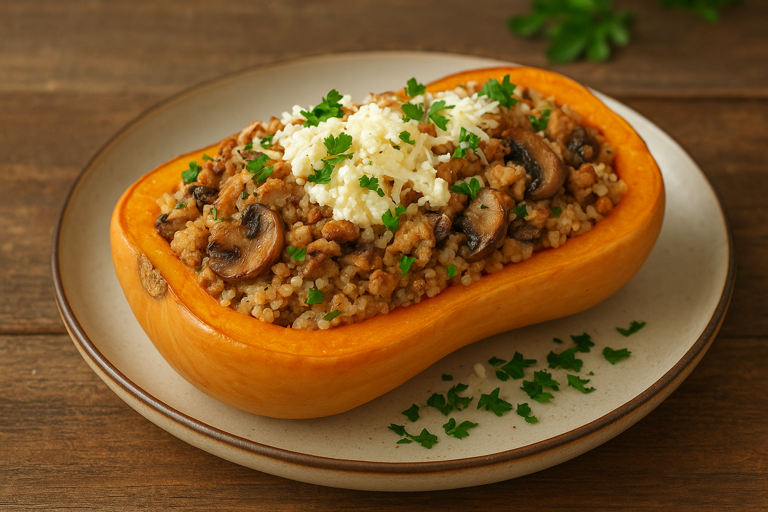 Butternut farci hachis de poulet ricotta champignons échalotes persil quinoa fromage râpé